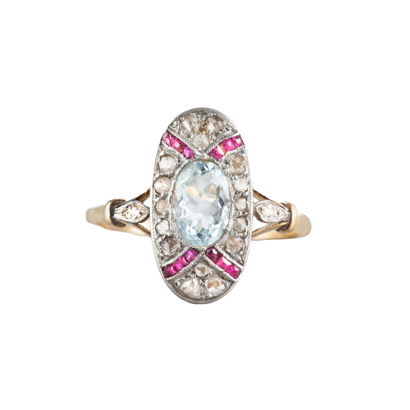 Aquamarine, Ruby & Diamond 18ct Gold Ring | Art Deco c.1930s