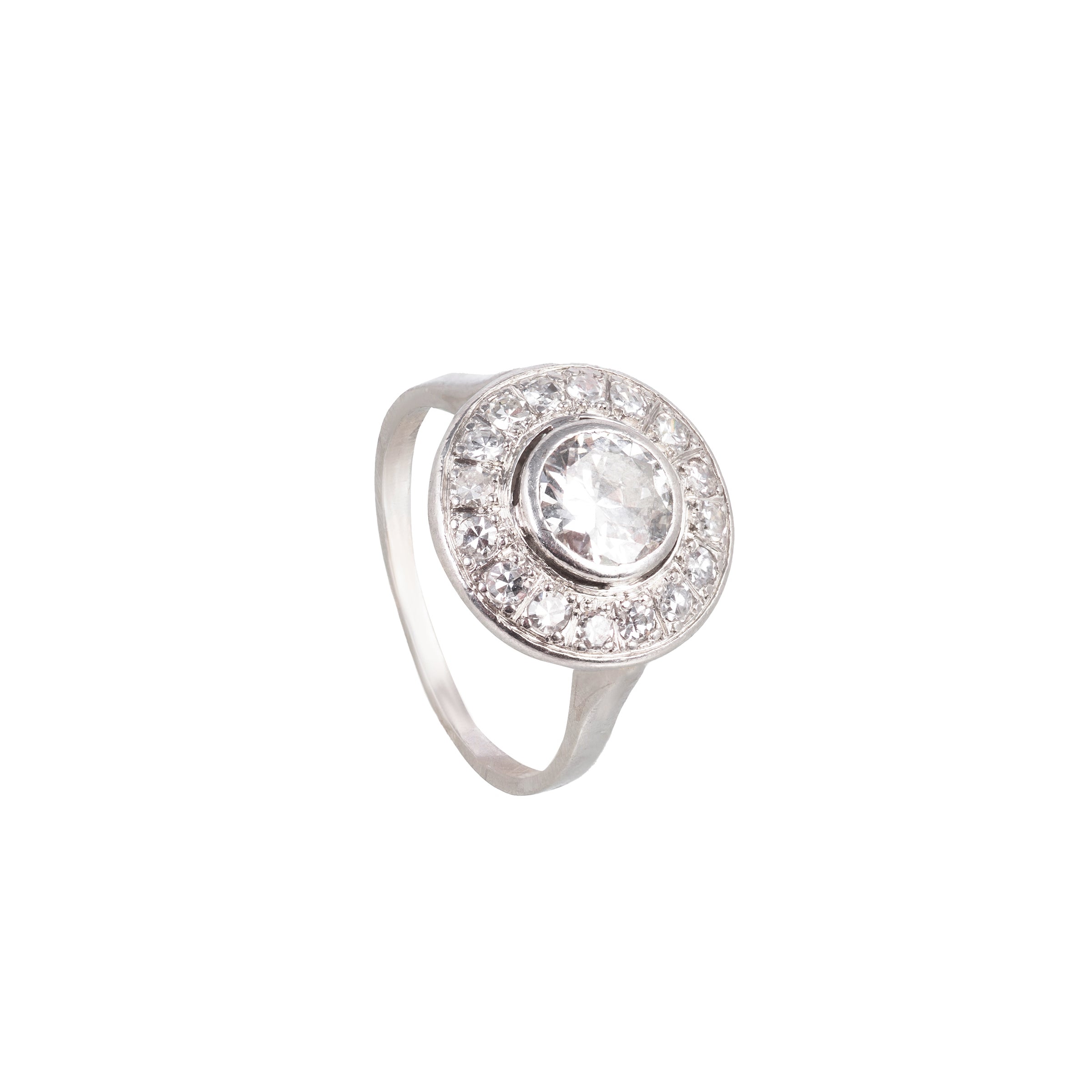 A beautiful French Art Deco diamond target ring from the 1920s, crafted in platinum and set with a bright one carat old European cut diamond at the centre, surrounded by a halo of smaller old cut diamonds totalling a further 0.80 carats.