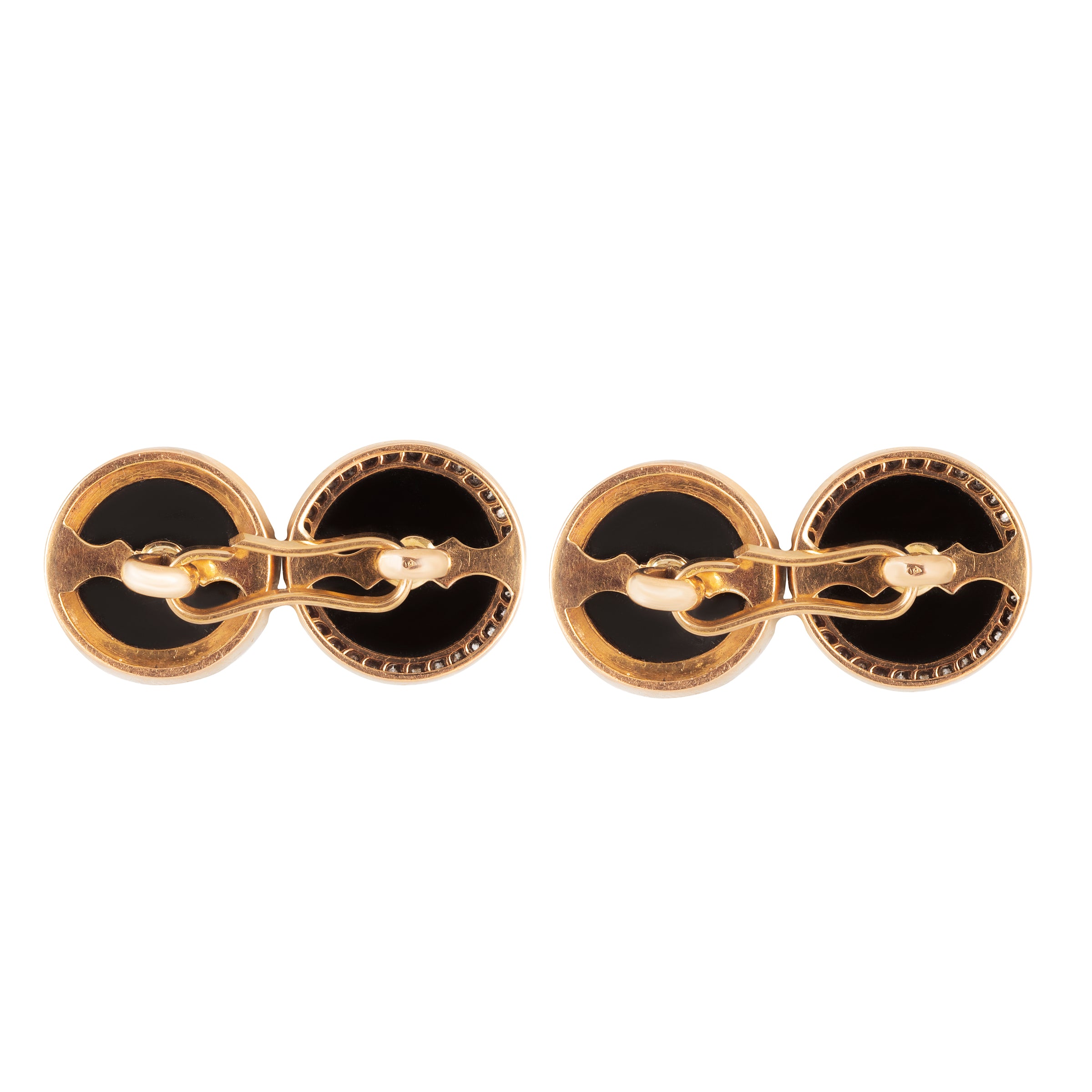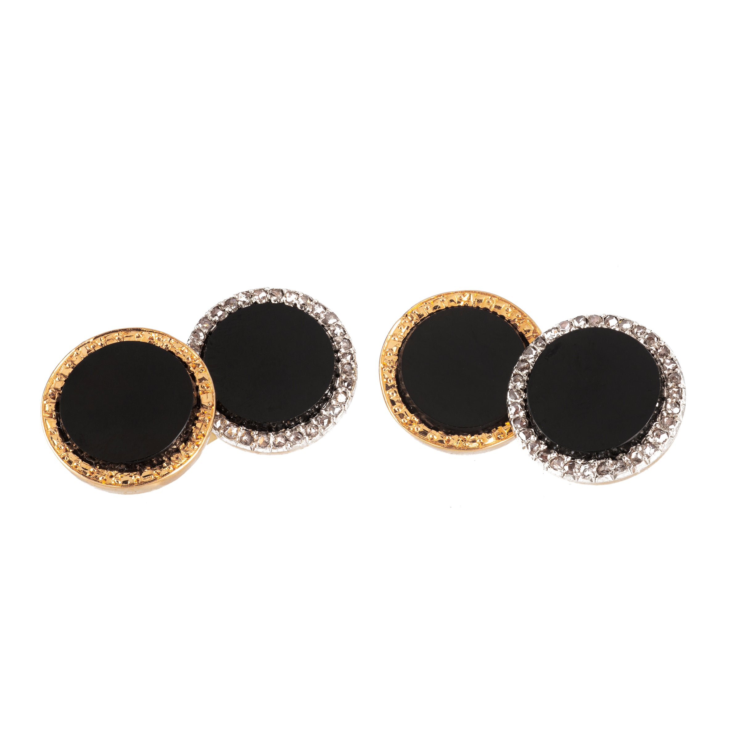 Each cufflink features a circular onyx centre framed by a border of diamonds, with an estimated total weight of 0.70 carats.